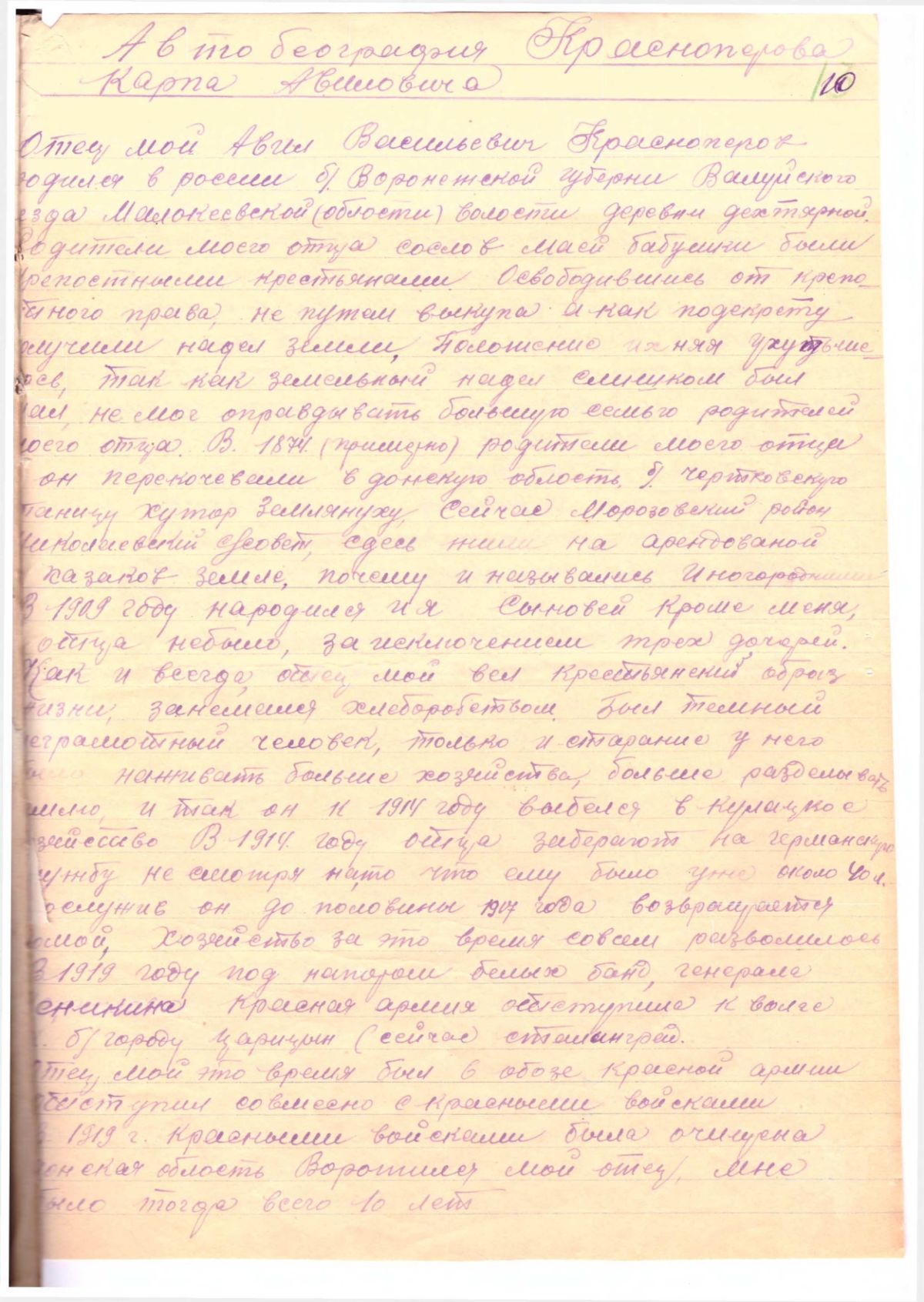 Мой прапрадед Краснопёров Карп Авилович, родившийся в 1909 году на хуторе Землянуха (Морозовский р-н, Ростовская область), был репрессирован дважды.