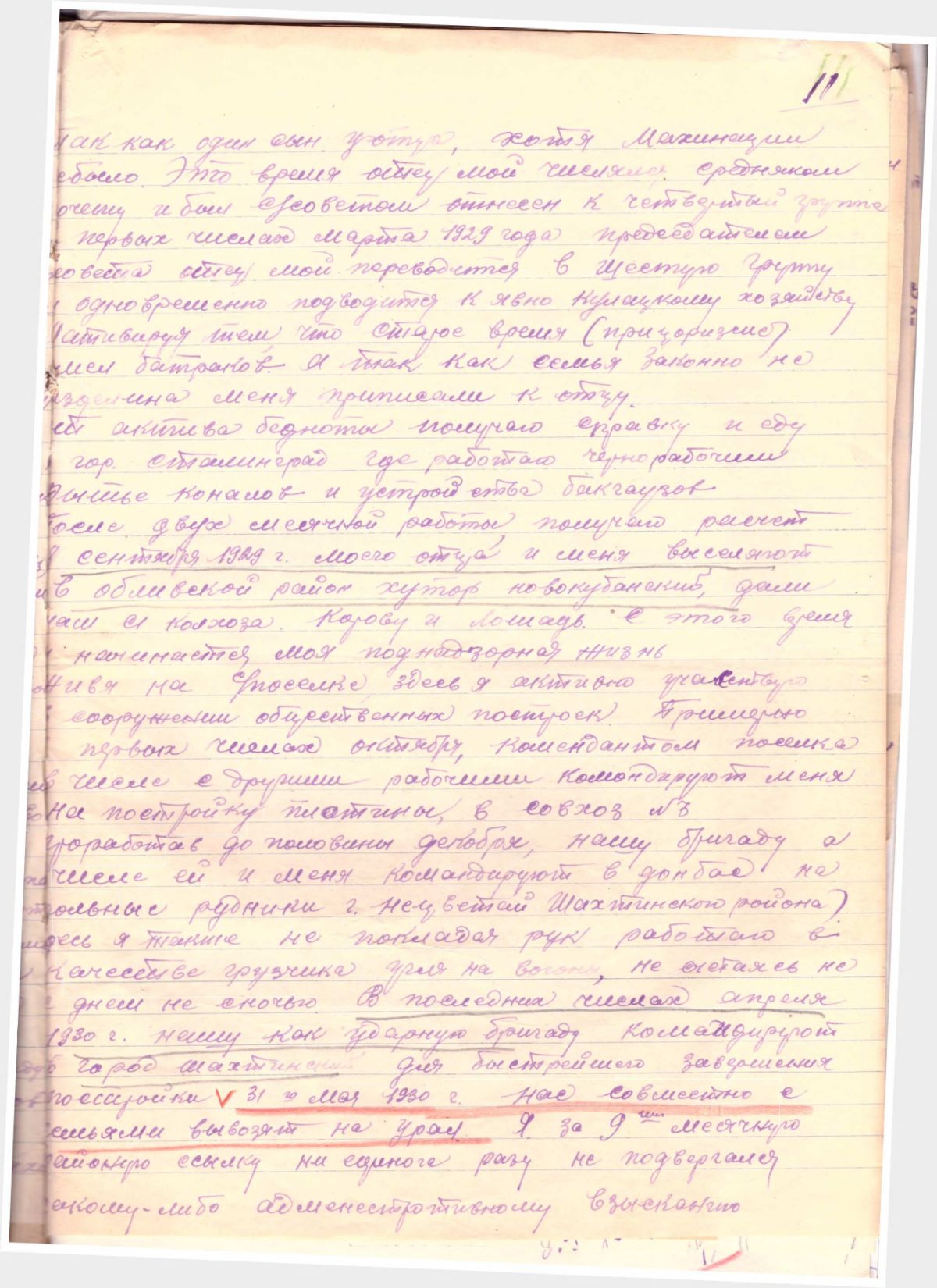 В 1930 году семья Краснопёровых (Краснопёров Авил Васильевич (1868 - 1933), его жена Пелагея (1872 - 1933), их сын Карп, сноха Анастасия и их дочь Устинья (1926 - 2002)) после раскулачивания была выслана на трудпоселение в Молотовскую область (Пермский край, Чердынский р-н, пос. Вижаиха).