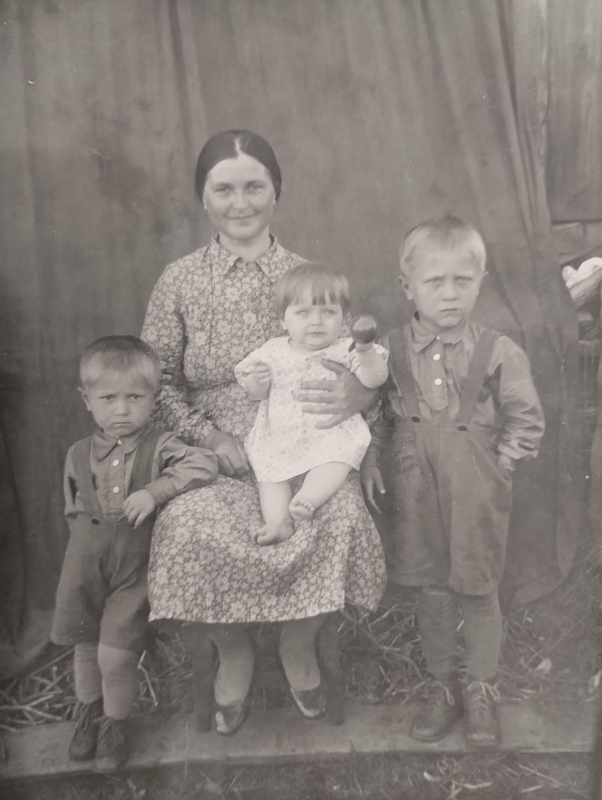 Меня зовут Цемина Ольга Александровна. На фотографии моя бабушка по линии отца Цемина Ульяна Матвеевна, 1910 г. р. В 1930 г. вместе с моим дедом Цеминым Владимиром Дмитриевичем, 1909 г. р. И старшей дочерью Анной были репрессированы и высланы в Свердловскую область. Проживали в д. Филькино Серовского района. На фото также слева мой папа Цемин Александр Владимирович, его старший брат Николай и младшая сестра Татьяна