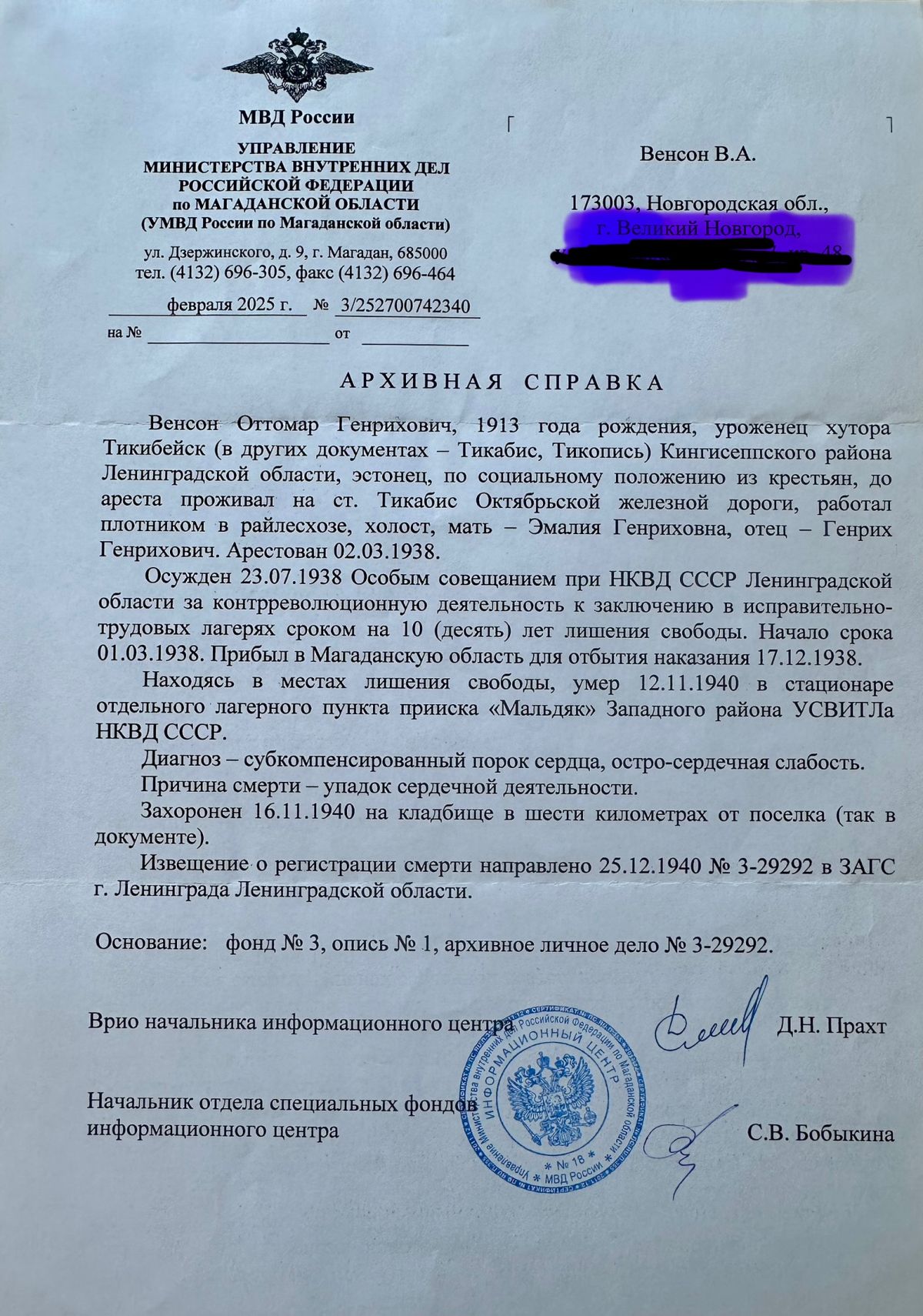 Короткие или отрывочные сведения, а также возможные ошибки в тексте — это не проявление нашей или чьей-либо небрежности. Скорее, это обращение за помощью. Тема репрессий и масштаб жертв настолько велики, что наши ресурсы иногда не позволяют полностью соответствовать вашим ожиданиям. Мы просим вашей поддержки: если вы заметили, что какая-то история требует дополнения, не проходите мимо. Поделитесь своими знаниями или укажите источники, где встречали информацию об этом человеке. Возможно, вы захотите рассказать о ком-то другом — мы будем вам благодарны. Ваша помощь поможет нам оперативно исправить текст, дополнить материалы и привести их в порядок. Это оценят тысячи наших читателей!